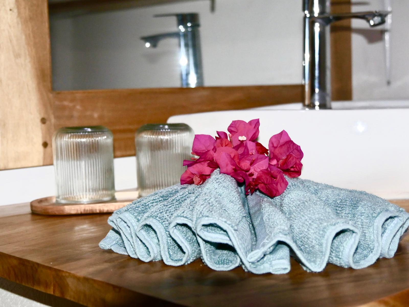 Each room has a private bathroom with a shower, toiletries, and towels.